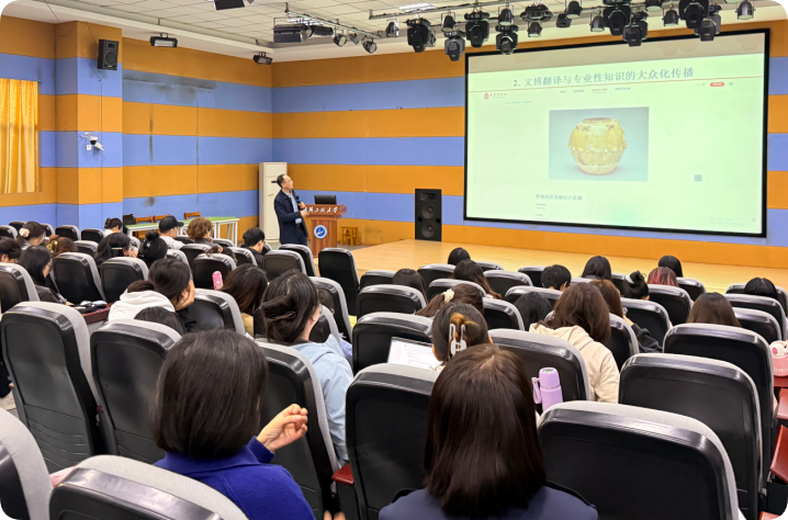 随后,覃教授从“知识翻译学”“翻译是人学”及“感官翻译”等前沿理论视角出发,结合故宫博物院、大英博物馆等场馆的文博翻译实例,进行了深入浅出的讲解。他指出,知识翻译学视域下的文博翻译强调具身体验、多感官参与和动态生成的重要性。此外,他还分享了如何利用人工智能技术赋能文博翻译实践,并结合教学经验,生动展示了AI作为辅助工具在提升翻译效率与创新性方面的作用。