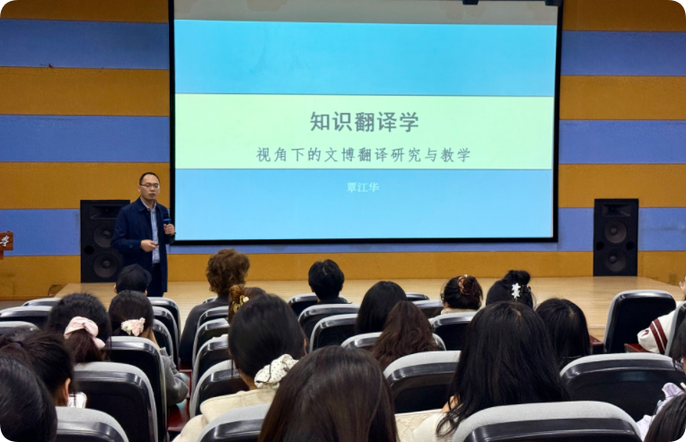 (通讯员:廉欣悦)2025年11月6日上午,华中师范大学外国语学院覃江华教授应邀做客学校研究生创新学术论坛,在文科楼313报告厅为vkgame电竞官网师生讲授题为“知识翻译学视角下的文博翻译研究与教学”的专题报告。本次讲座由刘茜茜老师主持,vkgame电竞官网教师代表及2025级全体研究生共同参与。