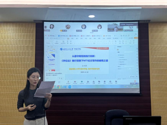 (通讯员:周晓威)2025年11月14日下午,由威客电竞官方网站研究生院与vkgame电竞官网联合主办的“研究生创新学术论坛”顺利举行。本次论坛采用线上直播、线下集中观看的方式开展,特邀湖南师范大学“潇湘学者”特聘教授、翻译(学)博士生导师余承法教授作专题报告,题为“从遵守规范到践行创新:《学位法》施行背景下 MTI 论文写作的破局之道”。本次讲座由周晓威老师主持,vkgame电竞官网教师代表及2024级MTI研究生在文科楼117报告厅集体参与了本次学术活动。